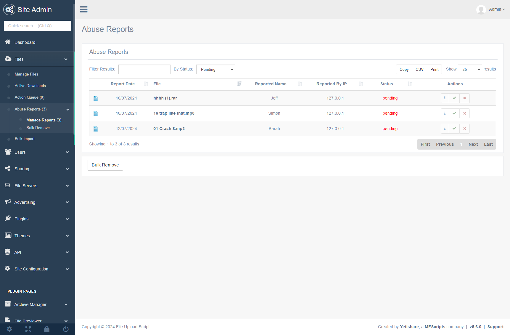 Instant file removal with single-click approval that immediately processes and removes reported content.